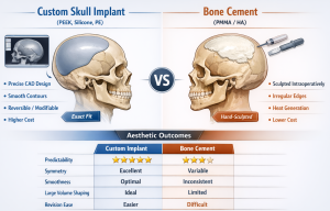 Aesthetic skull augmentation focuses on cosmetic contouring rather than reconstruction. That is a very important distinction as aesthetic augmentation requires material onlay on top of existing bone while reconstruction requires inlay material placement for bony skull defects. Such onlay augmentations can be done using a custom implant vs. bone cement (PMMA/HA). While they represent two available methods of skull augmentation their differences are significant from their techniques to effectiveness.