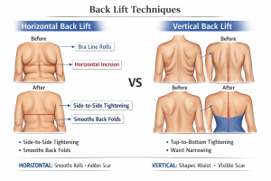 Back lifts are body-contouring procedures with several variations. These are often grouped together, even though they produce very different contouring effects. The key distinction lies in the direction of skin excision, which determines the aesthetic outcome.