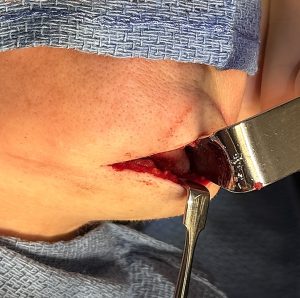 In most cases an external submental incision provides the necessary access to reduce the two dimensions that such bony chin bumps create (width and length). If the chin bump is width only then the intraoral approach can be used.