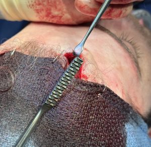 - Because incisions are located at or within the hairline, meticulous hair protection during high-speed burring is essential (e.g., guarded drill shafts and ensuring the shaft is fully within the incision before activation).