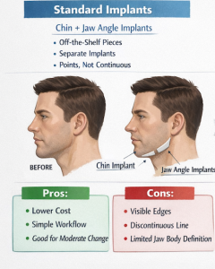If the goal is truly “total jaw augmentation”—a stronger chin and a more defined jawline from front to angle—custom jawline implants usually win aesthetically, because they can blend the entire mandibular border rather than creating separate highlights (chin + angle) with a flat mid-body.