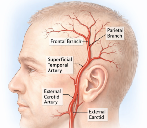 Cosmetic temporal artery ligation is a minor surgical procedure used to eliminate visible, pulsatile superficial temporal artery branches in the temple that patients find aesthetically undesirable. These arteries can become prominent with aging, low body fat, exercise, heat exposure, or prior facial surgery.