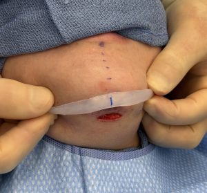 - While V line surgery may have been done intraorally the submental approach provides the accurate placement and the lowest risk of infection.