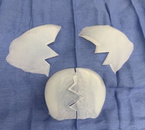Because of the implant’s considerable volume (300 cc), a first-stage scalp expansion was required over four months to generate adequate scalp stretch. A second-stage surgery was then performed to place the implant.