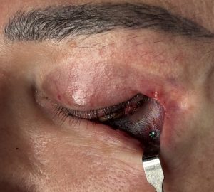 - Visible lumps/irregular texture, especially near the lower eyelid