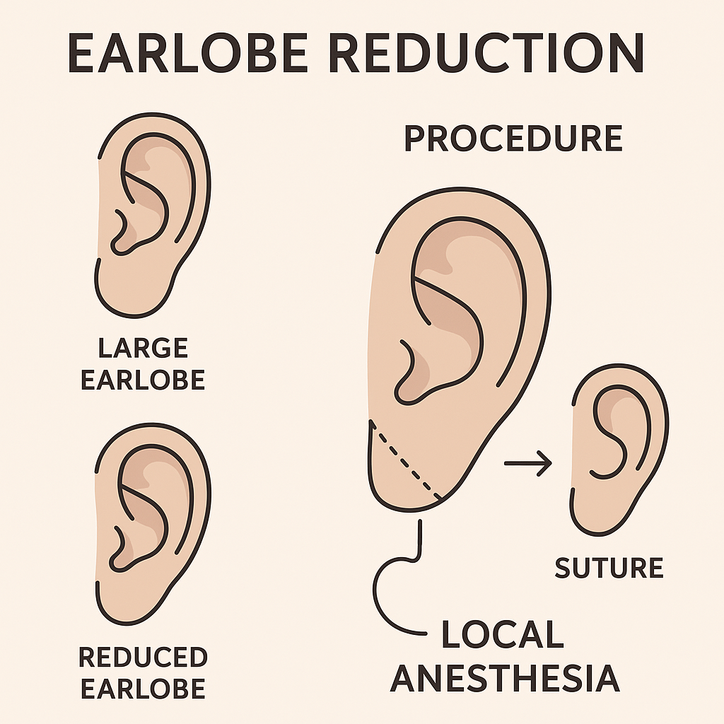 Earlobe reduction is a minor cosmetic procedure designed to make large, elongated, or stretched earlobes smaller and more proportionate. Patients commonly seek this procedure when their earlobes appear too long, wide, or heavy—whether naturally, from aging, or after years of wearing heavy earrings.