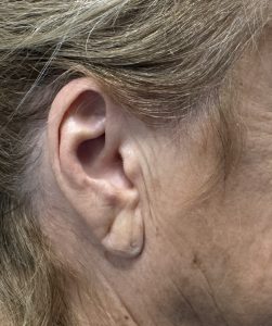 This older female patient had gradually developed elongated earlobes due to lifelong earring wear and naturally thinner soft tissues. Relative to the cartilage-bearing upper portion of her ear, the earlobes occupied a disproportionate amount of total ear height. Her vertical ear length measured 72 mm.