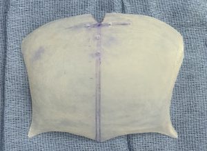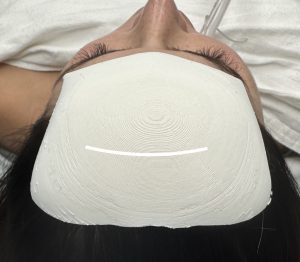 A custom forehead implant was designed to begin just above the brow bones and extend well behind the frontal hairline. Peak projection measured 5 mm in the upper forehead, tapering laterally to the bony temporal lines.