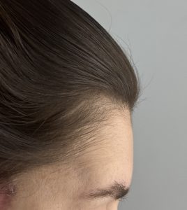 This female patient sought forehead augmentation for a recessed and vertically short forehead. She had a low frontal hairline with a vertical forehead height of approximately 5 cm. Her goals included increased convexity, a more vertical forehead slope, and subtle vertical lengthening of the forehead.