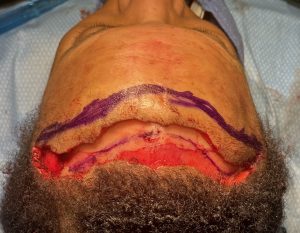 - The hair-bearing scalp is brought forward and sutured in place