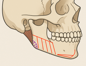 Jaw Angle Contouring: Through an intraoral approach, the outer cortical layer of the mandibular ramus up to the mandibular body was removed (red lines), and the jaw angle point (gonion) was resected full thickness (purple lines).