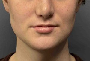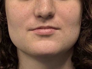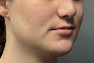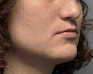 A young transfemale patient underwent comprehensive facial feminization surgery, including jaw reduction. She presented with a strong, wide jawline and a notably prominent chin.
