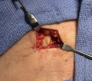 • A small incision is made parallel to the subcostal rib margin directly over the prominence