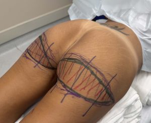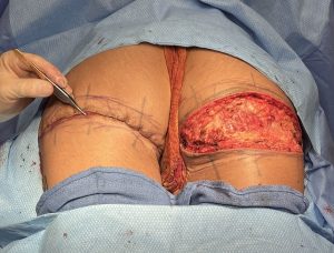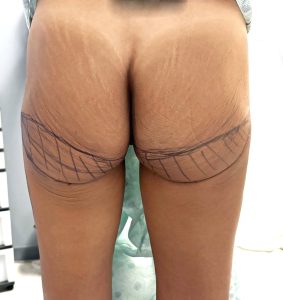 Stage 1: Lower buttock lift to improve contour and shorten buttock length.