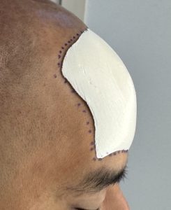 The vast majority forehead implants are custom made from the patient’s 3D CT scan. A limited number of off-the-shelf forehead implants are available for modest forehead contour changes. But the uniqueness of each patient’s forehead anatomy and their aesthetic goals make custom implant designs with the likelihood of an aesthetic outcome that comes the closest to the desired outcome While different implant materials exist solid silicone is preferred as it can be placed through the smallest possible scalp incision and the easiest to revise.