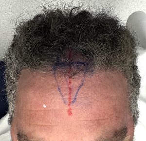 His history included submuscular temporal augmentation with PMMA bone cement placed in the deep temporal fossa. As a result, he did not exhibit significant temporal hollowing, but the augmentation contributed to the perception of a narrow forehead—accentuating the appearance of the midline ridge. In effect, some features of a persistent metopic ridge had been previously recognized and partially addressed through temporal augmentation.