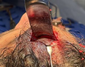 A critical component of successful reduction is incision placement. The incision must align closely with the forehead’s linear plane to ensure direct visualization and permit the use of straight instruments and powered equipment. As with all forehead bony procedures, working from a scalp incision farther back on the head is ineffective; one simply cannot “work around the corner.”