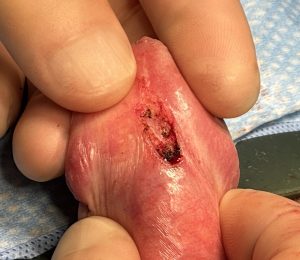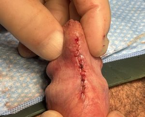 Once the testicle implants were placed the penile frenum was excised with the followng technique: