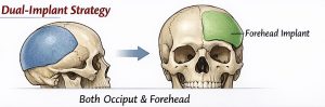 In more complex cases, multiple implants (forehead + occiput) may be used in one surgery.