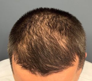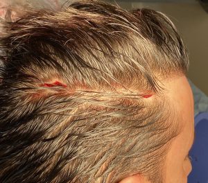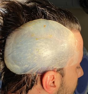 The large right custom skull implant was placed through an existing hair transplant scar on the back of his head aided by two smaller anterior incisions to help with pocket dissection and for screw fixation.