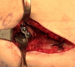 The overlapping bone segment is excised, and the rib is stabilized using a four-hole rib fixation plate with two self-drilling 7-mm screws on each side.