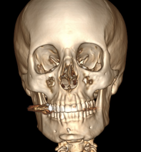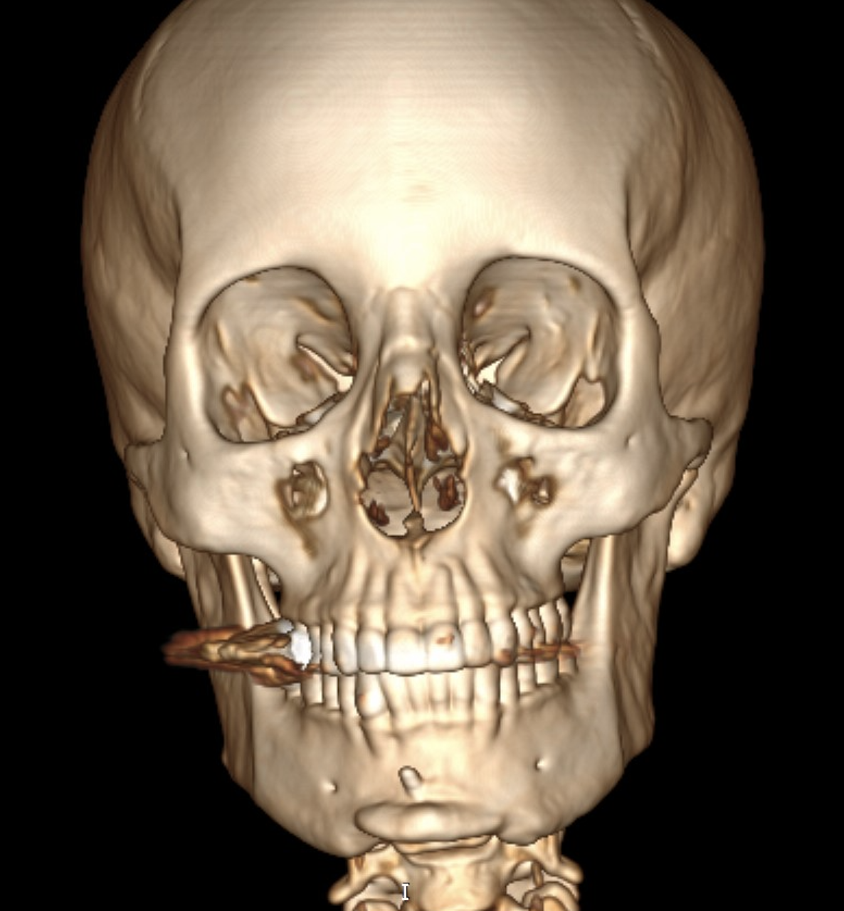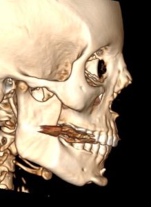 She also had pre-existing congenital chin asymmetry, with the right side longer than the left. A 3D CT scan confirmed: