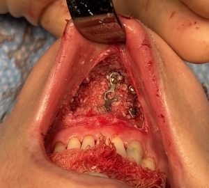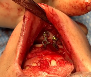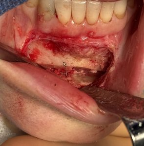 Bone grafting: The resected bone was used as an interpositional graft, repositioning the chin 2–3 mm downward and slightly leftward. Double-plate fixation secured the segment.