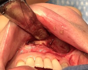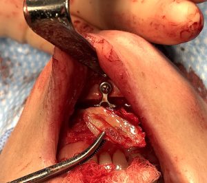 Through the prior intraoral incision, the osteotomy site was re-exposed. A protruding wire ligature tail was identified. The osteotomy line was recut, the segment down-fractured, and the wire removed.