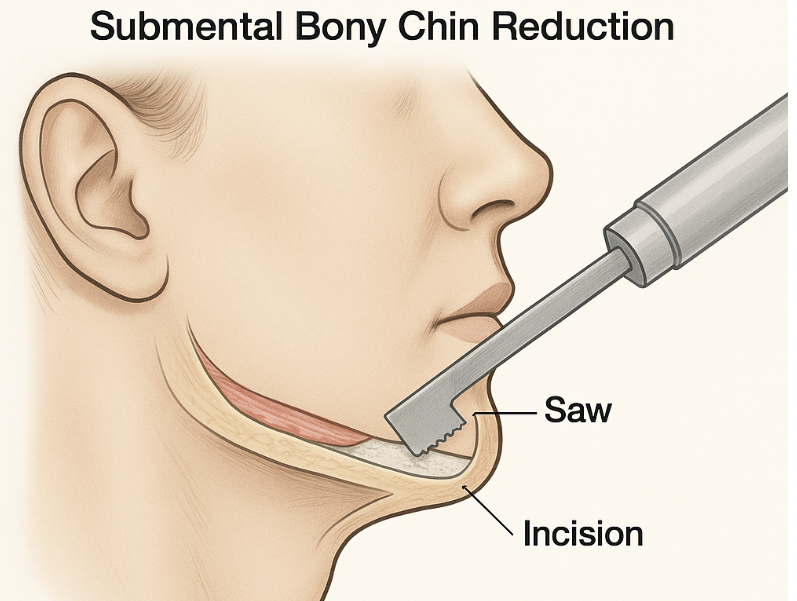 Bony chin reduction, when performed by shaving, can be done from two different approaches, either from above (intraoral) or from below (submental). While both approaches provide access to the chin bone the dimensional reductions that can be achieved between ram are different.