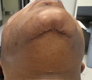 Under general anesthesia, a crescent-shaped excision was marked with its base along the submental crease and the arc extending upward into the soft-tissue chin pad. A full-thickness soft-tissue excision was performed down to the bone, followed by a multi-layer closure with resorbable sutures to redrape and secure the soft-tissue pad over the bone.