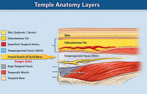 It runs within the superficial musculoaponeurotic system (SMAS)/temporoparietal fascia layer, just deep to the subcutaneous tissue in the temple.