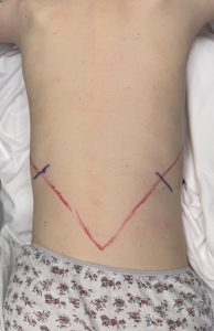 - V-shaped back mark delineating symmetric medial extent of rib resection