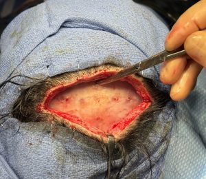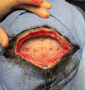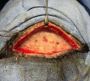 • A subperiosteal pocket is then carefully created over the frontal bone—and, when necessary, extended laterally over the temporal bone—to accommodate the implant.