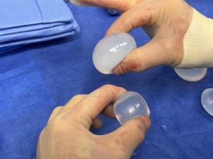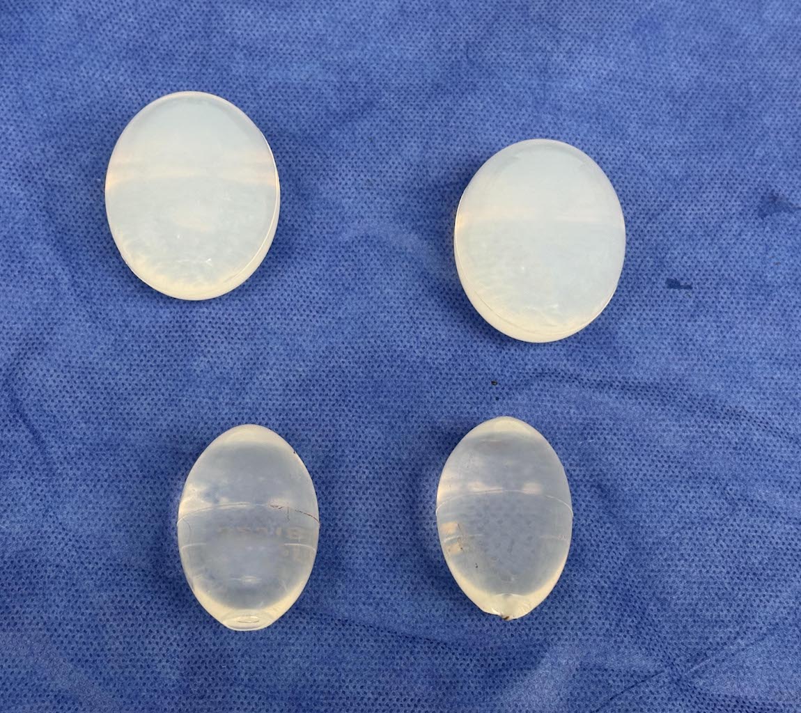 Comparing the removed 4.0 cm saline implants to the replacement 5.0cm silicone implants their size and shape differences could be clearly seen. Also, the increased softness of the larger silicone implants under compression compared to the firmer smaller saline implants could also be appreciated.