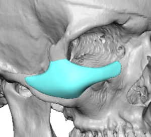 Instead of only pushing the rim forward, the implant extends the rim downward, increasing the vertical distance between the orbit and the cheek platform.