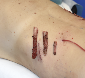 - Rib is delivered in a longitudinal fashion through the incision at 90 degrees from its orientation along the rib cage