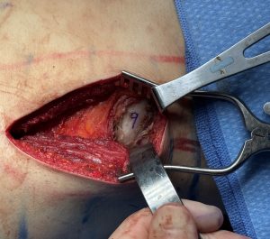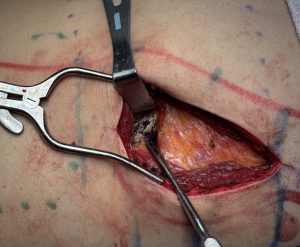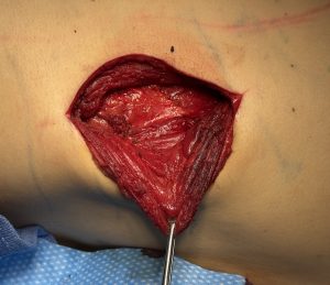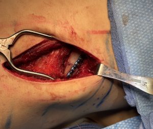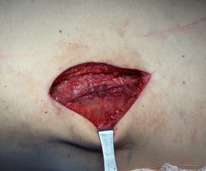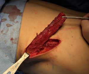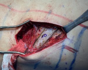 Under general anesthesia, the patient was positioned prone. The ribs were accessed by splitting the thick latissimus dorsi muscle, exposing the serratus muscle and underlying ribs.