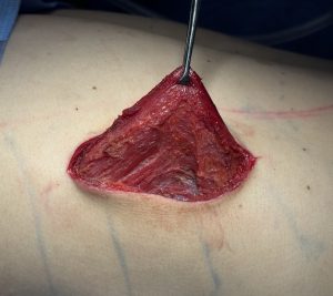 The latissimus dorsi muscle was reduced in width by excising a 4 cm-wide segment over a 30 cm length, extending beyond both the upper and lower ends of the incision. Removal along the muscle split allowed the lateral border to be advanced inward and sutured to the medial muscle edge, maintaining a smooth contour while achieving significant inward repositioning.