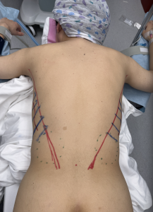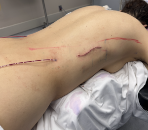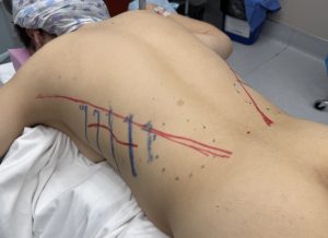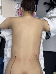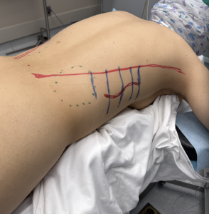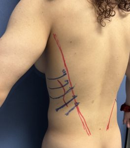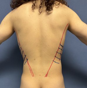 An oblique red line was marked from the upper buttocks to the axilla to guide the proximal rib cuts. A wavy lateral back incision was planned and marked between the levels of ribs 8 and 11. The patient expressed no concern regarding scarring and prioritized maximal surgical effect.