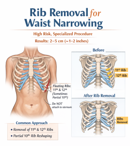 Rib removal is not a first-line waist-narrowing procedure. It should only be considered after fat and soft-tissue solutions have been exhausted and when skeletal anatomy—not adiposity—is the primary limiting factor. Even then, the torso-narrowing effect remains inherently limited.