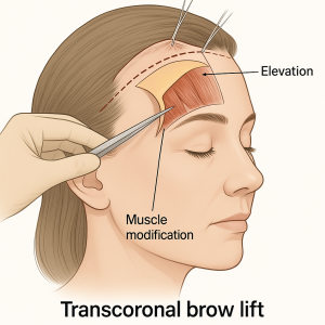 A transcoronal browlift (also known as an open or coronal browlift) is a classic technique designed to elevate and smooth the forehead, reduce glabellar frown lines, and reposition ptotic brows. The approach involves an incision across the scalp, typically behind the hairline, extending from ear to ear. This provides direct visualization and access to the forehead tissues and underlying musculature. Although highly effective, this technique has largely been supplanted by endoscopic methods that minimize scarring.