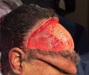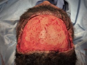 Under general anesthesia, the existing coronal incision was reopened from ear to ear, and the forehead flap was elevated over the brow bones and atop the deep temporal fascia. Relaxing incisions were made in the galea to allow maximal flap mobilization.
