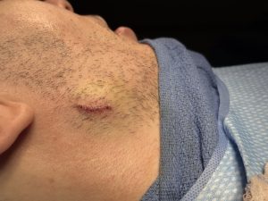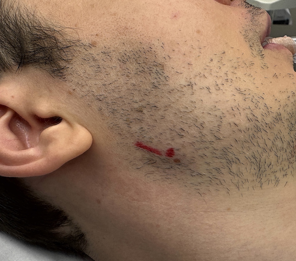 The direct transcutaneous approach to the jaw angle region has been described in reconstructive surgery but, to my knowledge, not previously in aesthetic implant revision. It has proven to be a safe and effective option in select cases. The resulting fine-line scar is typically well tolerated in male patients; however, scar acceptability in female patients remains a concern due to cosmetic visibility.
